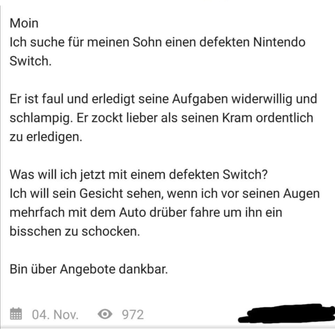 Ich musste herzlich lachen als ich diese Kleinanzeige gelesen habe. Zu gerne hätte ich mit einem defekten Nintendo Switch ausgeholfen. 😄 Ungewöhnliche Massnahme, aber herrlich ehrlich! Frohe Weihnachten an den Sohn! 😄