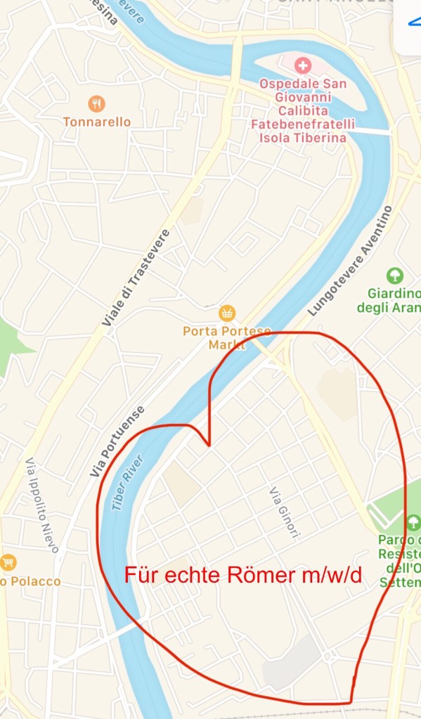 Ich gönne ihm die Genugtuung. Wir Bewohner von Testaccio sind großherzig und großzügig, was andere Meinungen betrifft. Das können wir auch sein, wissen wir doch, dass das beste Viertel Roms konkurrenzlos „Testaccio“ ist.