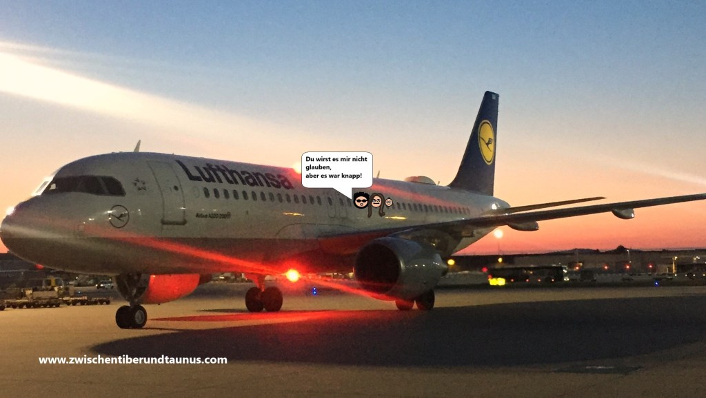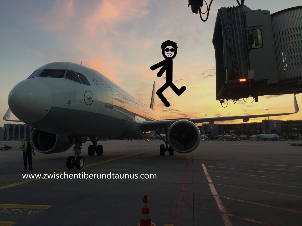 Dort angekommen dürfen Signorino und ich direkt zur netten Bodenstewardess gehen und müssen uns nicht in der Schlange anstellen. Unsere Bordkarten werden gescannt und wir laufen den langen Gang hinunter bis zum Flugzeug. Als wir freundlich grüßend bei der diensthabenden Kabinenchefin vorbeihuschen, höre ich, wie sie ihrer Kollegin zuflüstert: „Mutig – allein mit einem Baby zu reisen. Ich habe mich das ja nie getraut.“ Ich lächle und gucke auf die Uhr. Noch maximal 10 Minuten und die Türen werden geschlossen. Wenn es der Römer bis dahin wirklich nicht schafft, bin ich tatsächlich alleinreisend mit Baby. Und er? Er ist einen Kopf kürzer.