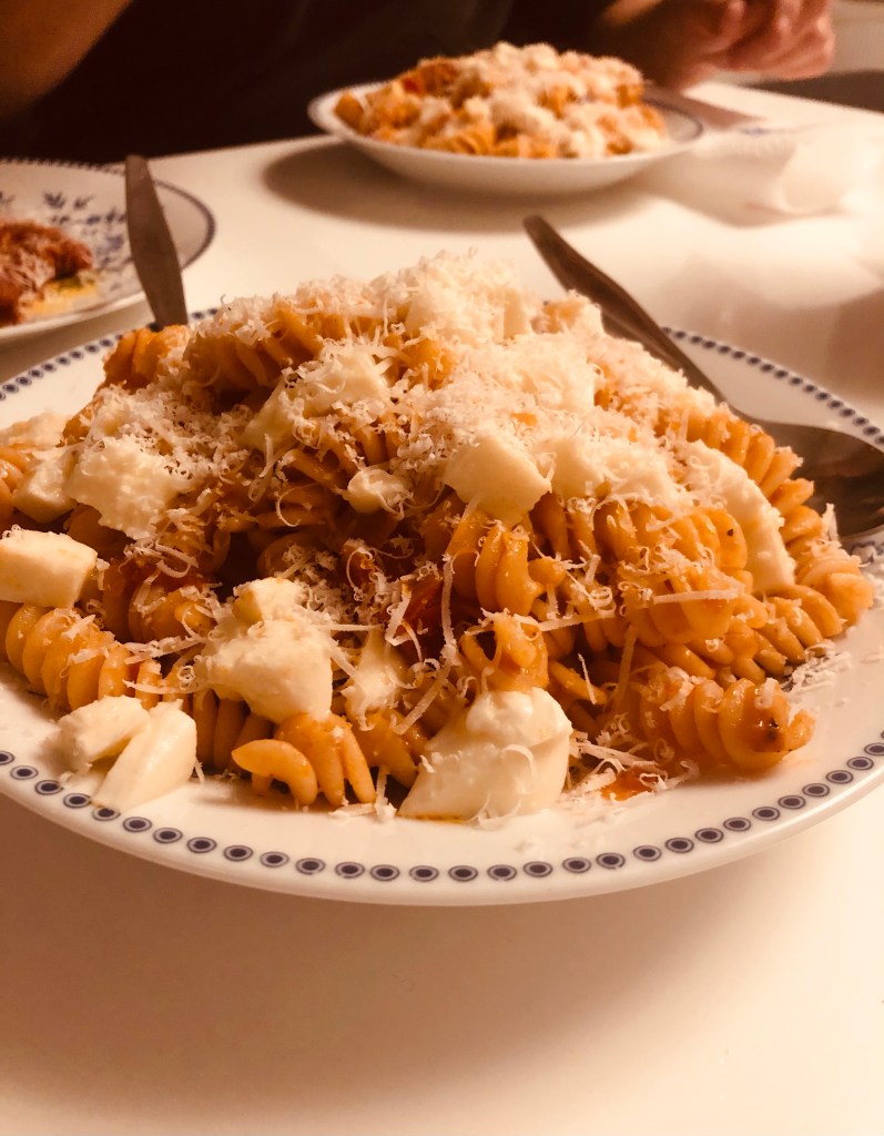 19:30 Uhr Der Römer ist so lieb und kocht. Nudeln mit Tomatensoße und Mozzarella. Ich stelle noch eine schnelle Waschmaschine an. Der Ableger beginnt aufzudrehen und abzudrehen. Abendstunde eben. Er isst zwei Nudeln, findet sie dann doof. Daraufhin isst er ein Stück Banane. Auch doof. Am Ende begnügt er sich mit Joghurt. Hauptsache er wacht nachts nicht hungrig auf.