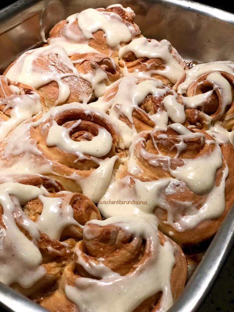 Sollten Sie, genau wie wir, unter Besucherarmut leiden und dazu nur wenige Esser in der Familie haben, empfehle ich Ihnen, die Zimtschnecken soweit vorzubereiten, dass Sie sie nur noch in die Auflaufform zum Backen geben müssten. Aber – und hier kommt mein Geheimtipp – Sie backen am besten nur die Zimtschnecken, die Sie sofort verbrauchen werden. Die restlichen Rohlinge geben Sie auf ein Schneidebrett oder eine offene Plastikdose und lassen sie im Gefrierfach wenige Stunden anfrieren. Dann steht der Umzug dieser Rohlinge in einen Gefrierbeutel an. Wann immer Sie nun Lust auf frische Zimtschnecken haben, nehmen Sie sich die gewünschte Menge aus dem Gefrierbeutel und backen sie frisch auf. 🙂 Das Frosting ist in wenigen Augenblick angerührt. Notfalls (!) kann es aber auch weggelassen werden.