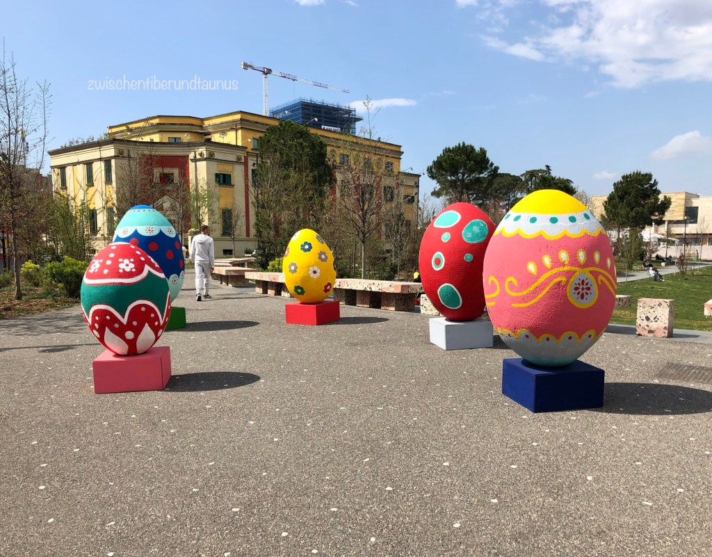 Auf dem Nachhauseweg fotografierte ich ein paar riesige Ostereier. Man sah, dass der (mittlerweile wiedergewählte) Premierminister Edi Rama nicht nur vormaliger Bürgermeister von Tirana, sondern auch ein begnadeter Künstler war. Erst als ich die Fotos auf meinem Handy kontrollierte, erinnerte ich mich daran, dass gerade Ostern war. Weitab von allem konnte man das schon einmal vergessen.