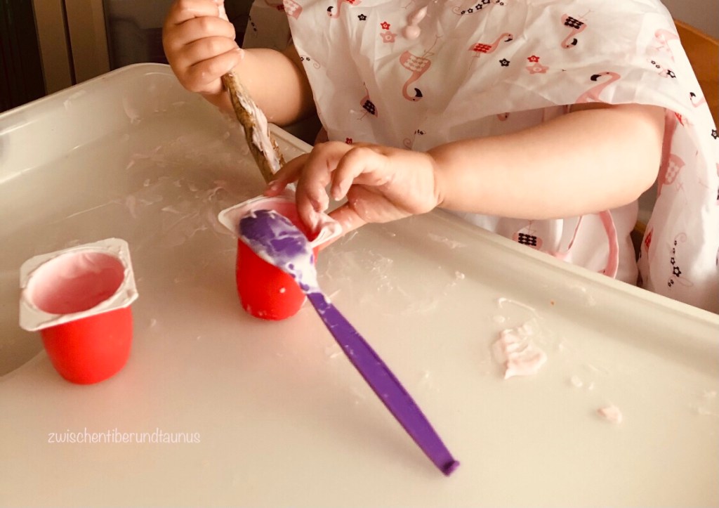 „Wie isst Signorino daheim?“, fragte die Erzieherin mich diese Woche. „Mit den Händen… und flüssige Sachen füttern wir ihm.“, antwortete ich wahrheitsgemäß. Sie runzelte die Stirn. „Also wir hier in der Kita sagen, dass Kinder mit 1,5 Jahren mit dem Löffel essen sollten. Das ist unser Standard hier.“ Ich nickte und versprach, mich darum zu kümmern. Das tat ich auch. Zwei Nachmittage versuchte ich, dass das Kind alleine einen Joghurt isst. Nachdem 2g Joghurt im Magen des Kindes landeten und 98g überall anders, von der Wand über den Schrank bis zum Tischchen, gab ich auf. Dann malte Signorino noch ein bisschen mit der Joghurt Pampe auf dem eh schon verhunzten Tischchen. So konnten wir immerhin einen künstlerischen Erfolg verzeichnen. Dennoch: Dinge mit dem Löffel zu essen und das mit 18 Monaten klappt bei uns nicht. Der Versuch ist (vorerst) für beendet erklärt!