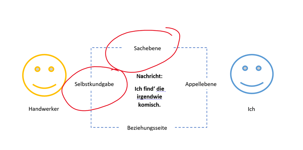 Knapp erläutert sehen Sie einen Kommunikator in Form des Handwerkers und einen Rezipienten, einen Empfänger, also mich. Wir haben die Nachricht, die er übermittelt und wir haben die vier Ohren, wie eine Nachricht gedeutet und interpretiert werden kann.