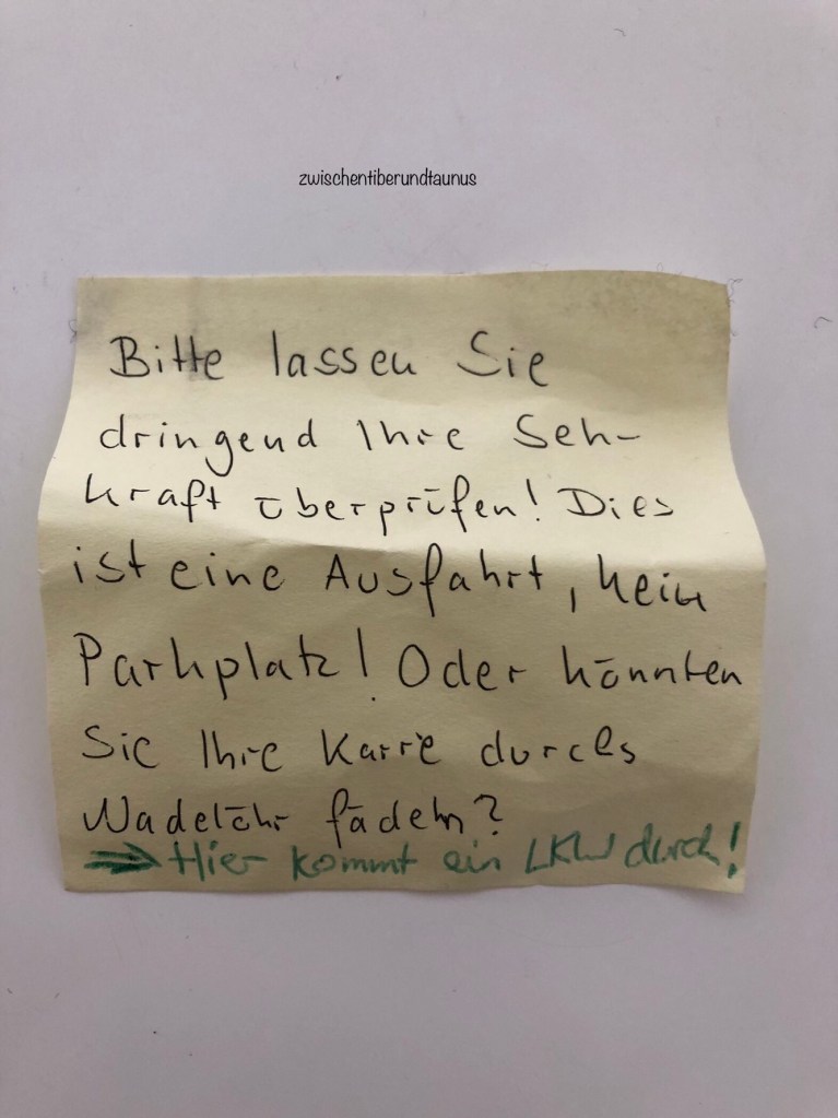 Das muss jetzt eine neue Mode sein, sich zu schreiben. Ich hatte kürzlich auch einen handgeschriebenen Zettel unter dem Scheibenwischer, wo sonst höchstens Werbung klemmt.