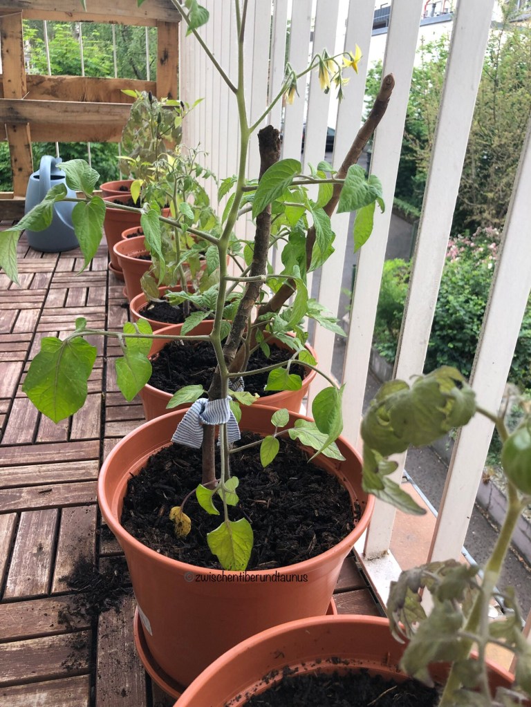 7 Tomaten und eine Chilli stehen auf dieser Seite des Balkons. Gurken, der Feigenbaum und der Granatapfelbaum stehen auf der anderen Seite.