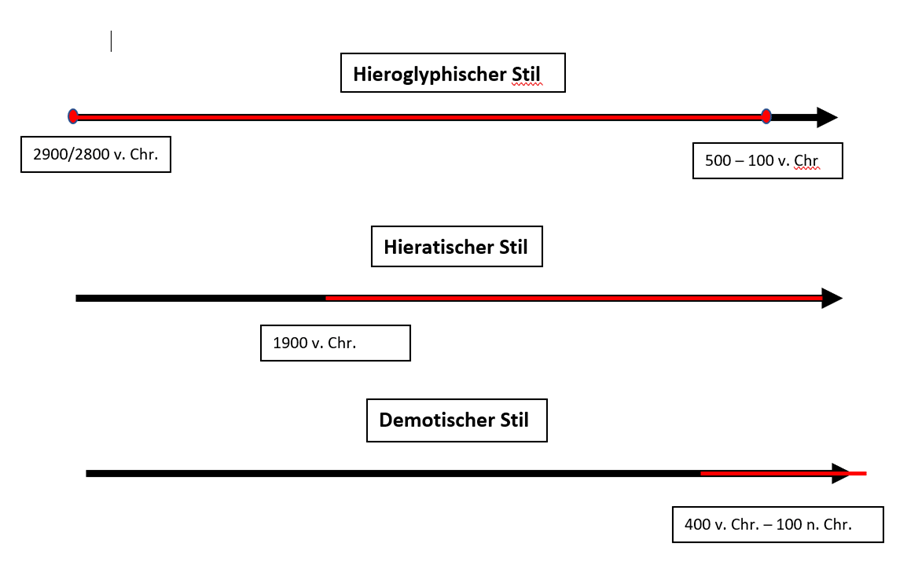 Dann gibt es den hieratischen Stil, der sich parallel zum hieroglyphischen Stil ab ca. 1900 v. Chr. entwickelte und als „starrer, monumentaler Repräsentationsstil“ bezeichnet werden kann. Um 400 v. Chr. entwickelte sich der demotische Stil, die Alltagsschrift, welche bis 100 v. Chr. benutzt wurde. (Quelle: Brockhaus 1992, S. 65)