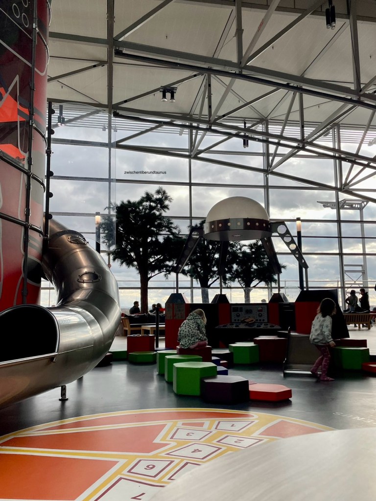 Schon am oberen Ende der Rolltreppe begrüßt uns die riesige Rakete am Indoor-Spielplatz, die in den Himmel ragt. Unser Kind findet’s klasse und saust sofort mit seinen Stoppersöckchen** los.