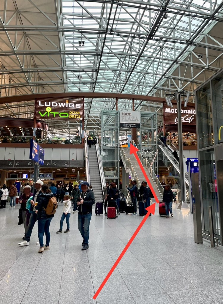 Angekommen im Terminal 2 fahren wir mit der Rolltreppe des Skytrains nach unten, um auf der gegenüberliegenden Seite die lange Rolltreppe wieder hochzufahren. Es gibt auch Lifte und somit ist alles barrierefrei zugänglich.