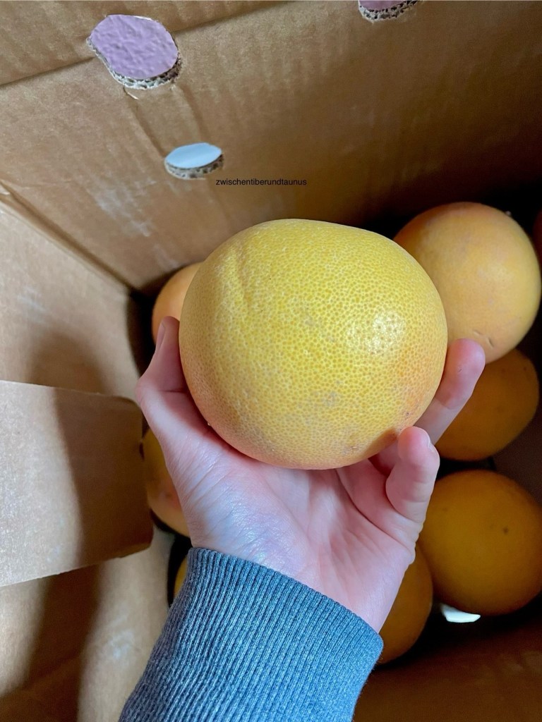 „Vado io, quando sto a casa. [Ich gehe zu den Nachbarn, wenn ich daheim bin]“, schreibt der Mann in der Zwischenzeit zurück. Ich atme erleichtert auf und tippe ein erfreutes „Okay, gerne“. In einem großen Mehrfamilienhaus auf die Suche nach einem 8,5 Kilo-Paket Grapefruits, also pomelo… nein, halt…pompelmo zu gehen – da kann ich mir weitaus schöneres vorstellen. Zum Glück hat der Mann dank seiner Pompelmo-Kur extra viel Energie, um sich auf die Suche nach seinen Schätzen zu machen. 😉