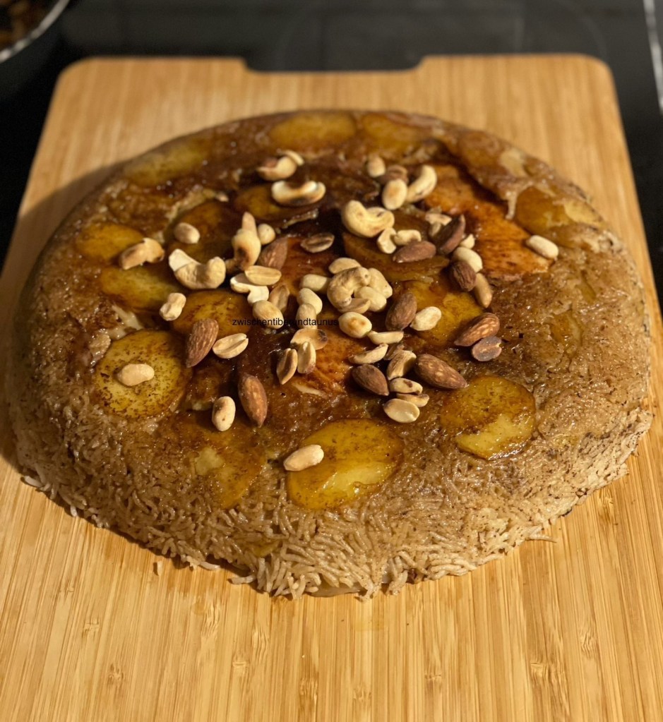 Maklube. Nicht im Bild: Das Chaos in der Küche. Altes Frittieröl kann man übrigens wunderbar in einer unbenutzten Windel entsorgen. 😉