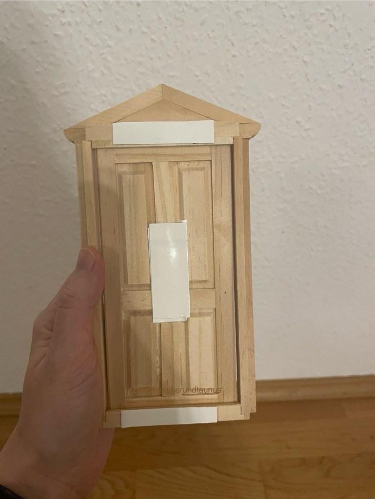 Es begann alles entspannt mit der Montage der Wichteltür. Ich klebte sie mit doppelseitigem Klebeband für die Tapete an unsere Wand.