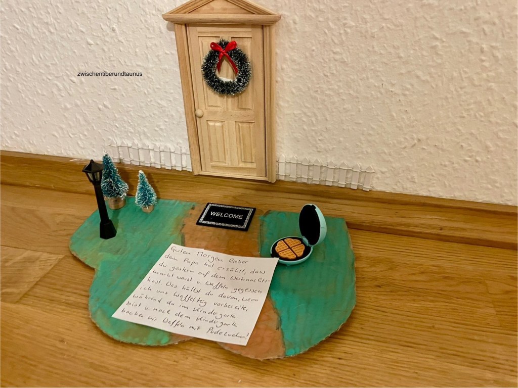 Diesmal machte ich es mir sehr einfach und zückte das kleine Waffeleisen, das ich vor die Wichteltür stellte. Dazu schrieb ich der Wichtel, dass Signorinos Papa erzählt habe, dass er gestern sehr gerne Waffeln mit Puderzucker auf dem Weihnachtsmarkt aß und so dachte sich der Wichtel, dass er einen Teig für die Waffel vorbereiten werde während Signorino im Kindergarten ist, damit wir beide heute Nachmittag frische Waffeln mir Puderzucker backen können.