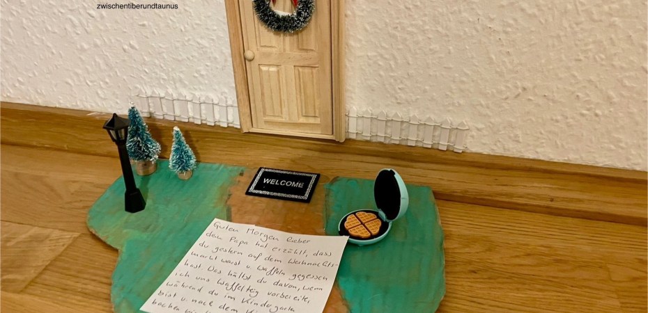 Diesmal machte ich es mir sehr einfach und zückte das kleine Waffeleisen, das ich vor die Wichteltür stellte. Dazu schrieb ich der Wichtel, dass Signorinos Papa erzählt habe, dass er gestern sehr gerne Waffeln mit Puderzucker auf dem Weihnachtsmarkt aß und so dachte sich der Wichtel, dass er einen Teig für die Waffel vorbereiten werde während Signorino im Kindergarten ist, damit wir beide heute Nachmittag frische Waffeln mir Puderzucker backen können.