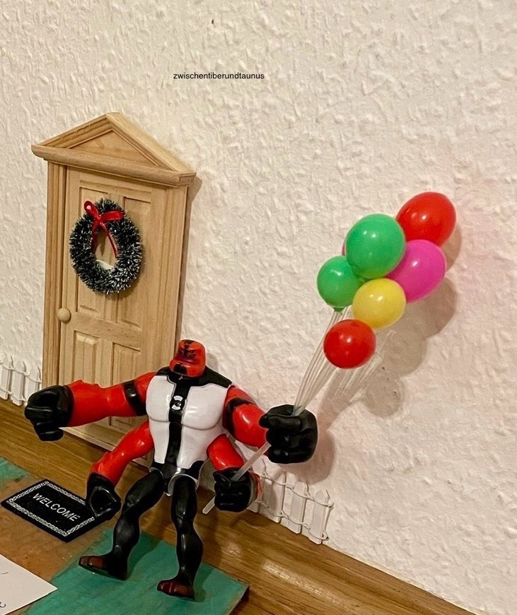 Er rennt zur Wichteltür – nur mit Leggings bekleidet und im Unterhemd – und sieht seinen Ben-10-Freund Krake, muskelbepackt und grimmig, mit einem Bündel Luftballons neben der Tür lehnen.