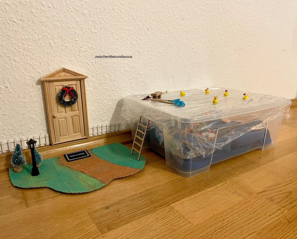 Dann überspannte ich den See mit einer Eisfläche aus Frischhaltefolie. Drei Schichten, ein bisschen Klebeband und einen Schlitz in der Mitte später, konnte ich die Entchen, das Angelzeug und die Bank auf die Eisfläche stellen. Dann installierte ich den See neben der Wichteltür und lehnte noch eine Leiter an das Gewässer. Fertig!
