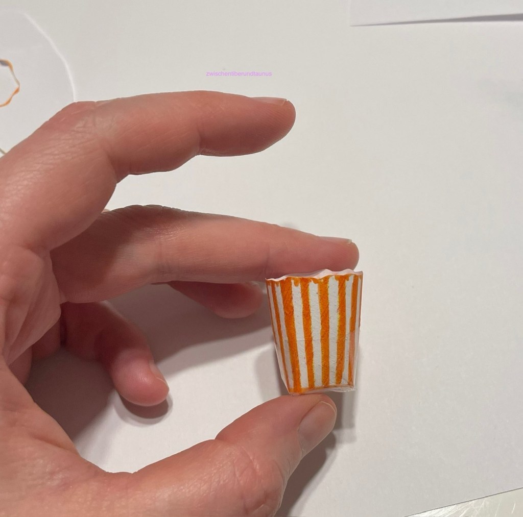 Ich bastelte eine kleine Popcorntüte (die Anleitung habe ich hier gefunden). Das dauert ca. fünf Minuten für Geübte und zehn Minuten für Ungeübte wie mich. Dann befüllte ich die Popcorn-Tüte mit lauter Maiskörnern und schrieb auf den Zettel Ingmars Zeilen.