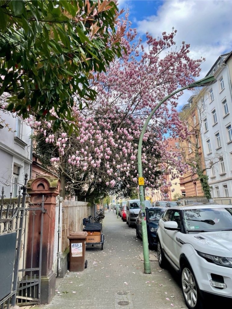Bei Bizziice (sprich: Bitzi-Eis) waren wir an einem schönen, sonnigen Apriltag, bei dem man dennoch die dünne Daunen-Jacke brauchte. Signorino war im Kindergarten und wir schlenderten mit Bianco in der Trage durchs Frankfurter Nordend. Die Magnolien blüten – es war herrlich!