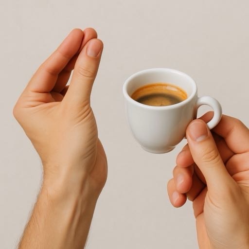 Sogleich lieferte ich pantomimisch die Erklärung mit Hilfe einer geschickten Tassen-Schlürf-Bewegung. Die virtuelle Espressotasse hält man natürlich anders, als eine Teetasse. Schließlich ist sie sehr klein.